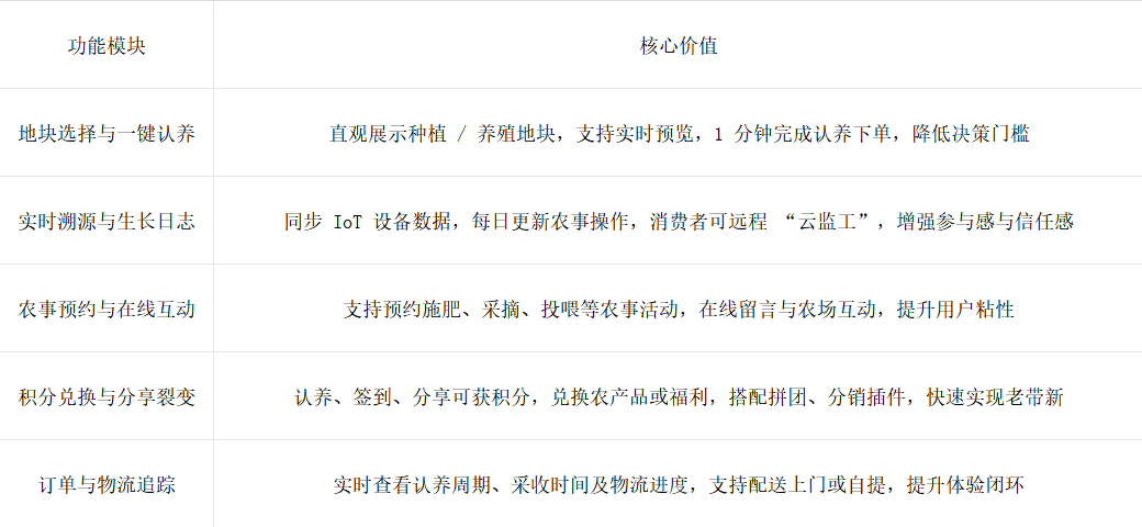 三、功能體系:全鏈路閉環(huán)覆蓋認(rèn)養(yǎng)全場景
