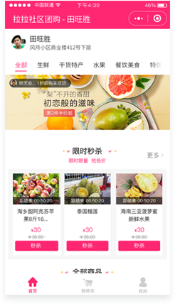 是一種全新的團購模式,平臺統(tǒng)一提供相應(yīng)產(chǎn)品、通過小區(qū)團長、輻射小區(qū)用戶。社區(qū)用戶在小程序下單后、平臺可直接發(fā)貨至用戶,或用戶至團長處自提。平臺通過【預(yù)售+拼團】,拼團以銷定產(chǎn),降低損耗和成本、用戶可得到真正的實惠。